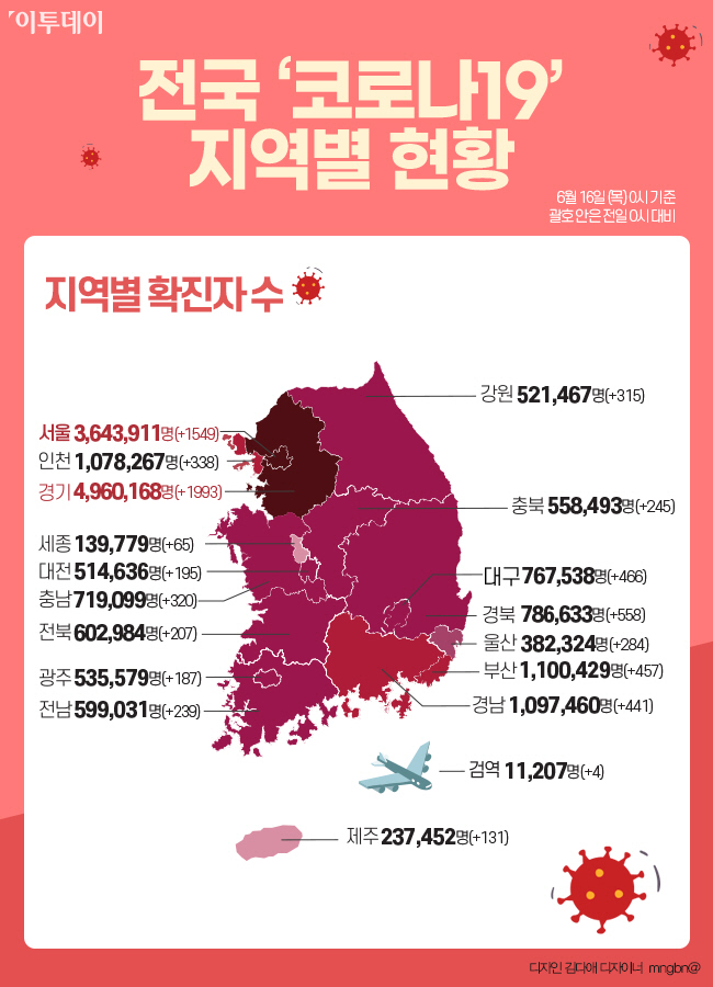 신규 확진자 7994명 중 1549명은 서울에서 발생했으며, 부산 457명, 대구 466명, 인천 338명, 광주 187명, 대전 195명, 울산 284명, 세종 65명, 경기 1993명, 강원 315명, 충북 245명, 충남 320명, 전북 207명, 전남 239명, 경북 558명, 경남 441명, 제주에서 131명이 각각 확진됐다. 확진자 7994명 중 지역발생 확진자는 7904명으로 집계됐다. 검역소 확진자도 4명이 추가됐다.