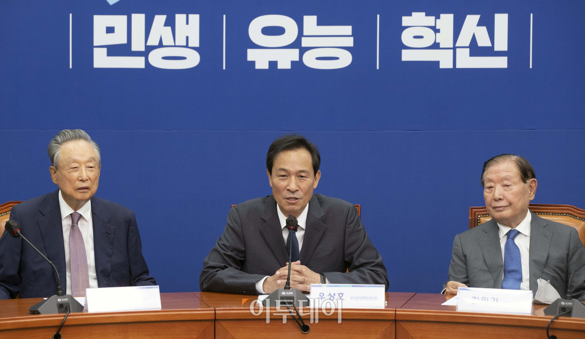 우상호 더불어민주당 비상대책위원장이 16일 국회에서 열린 상임고문단 간담회에서 모두 발언을 하고 있다.