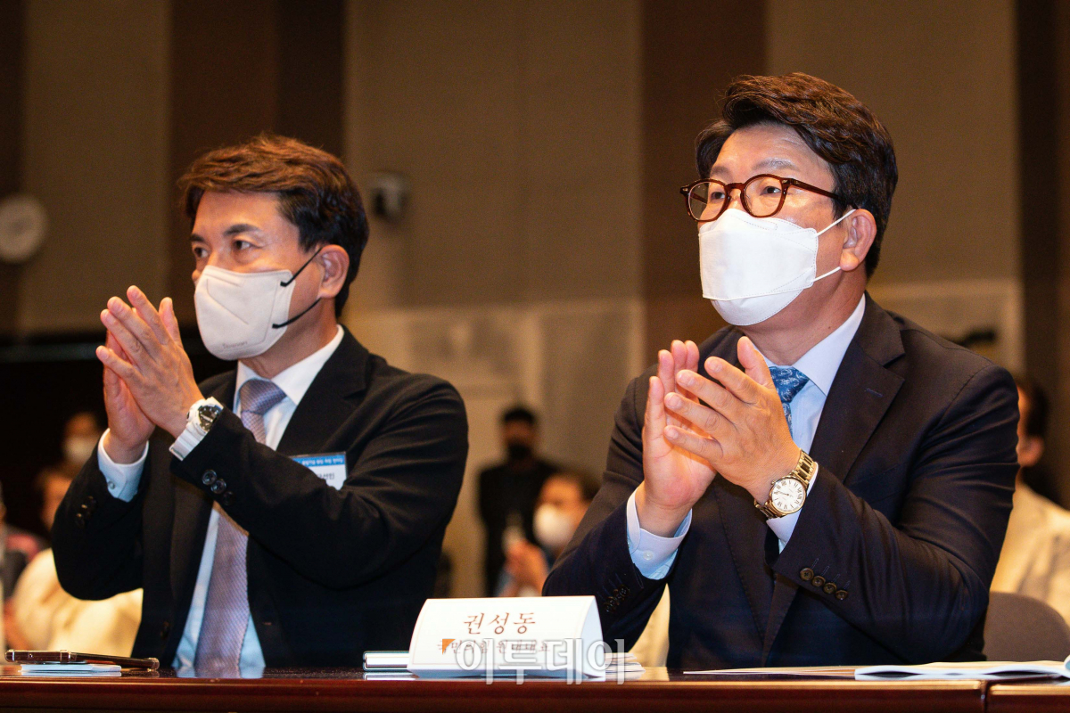권성동 국민의힘 원내대표(오른쪽)와 김진태 강원도지사 당선인이 16일 서울 중구 프레스센터에서 열린 윤석열 정부와 강원특별자치도 법제화 비전선언 심포지엄에서 박수를 치고 있다. 국회사진취재단