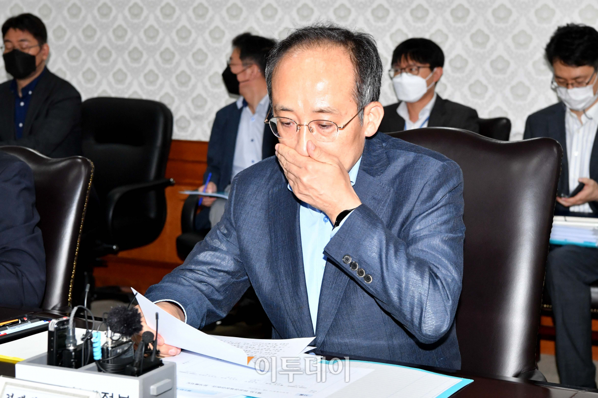 추경호 부총리 겸 기획재정부 장관이 19일 서울 종로구 정부서울청사에서 열린 제1차 비상경제장관회의에서 모두발언을 앞두고 자료를 살펴보고 있다.