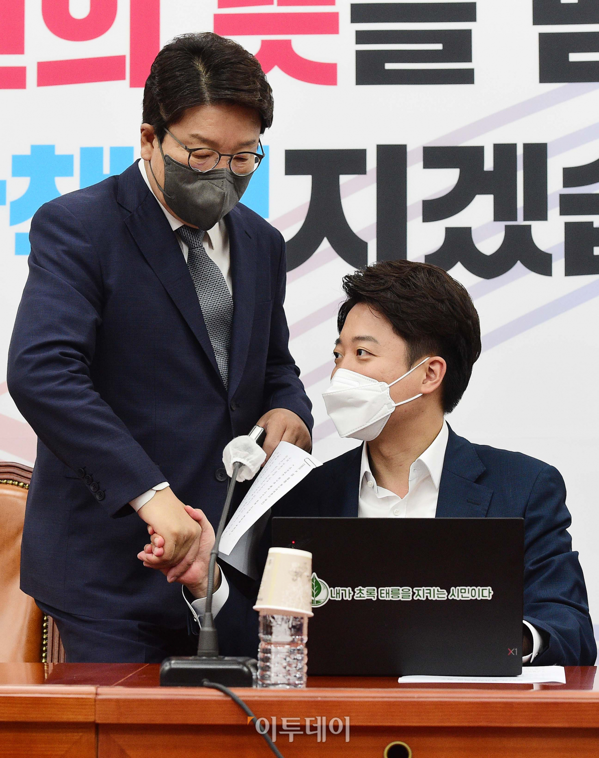 이준석 국민의힘 대표와 권성동 원내대표가 20일 국회에서 열린 최고위원회의에서 인사를 나누고 있다.