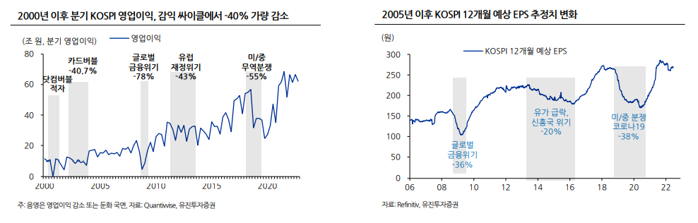 이어 유진투자증권은 “(코스피 상장사들은) 미국 기업들보다 실적 변동성이 크다는 약점이 존재한다”며 “코스피 영업이익은 2000년대 이후 이익 감소 국면에서 기간에 따라 평균 40% 이상 감소했고, 지난해 4분기 이후 코스피 영업이익은 이미 20% 감소했다”고 설명했다.