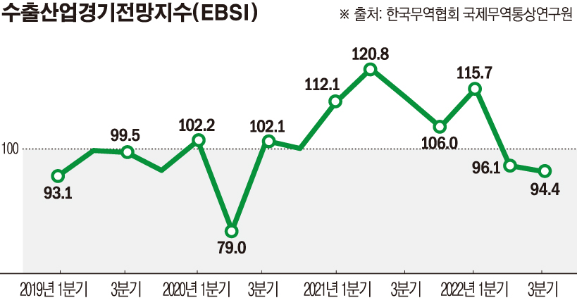 한국무역협회 국제무역통상연구원은 26일 국내 1301개 수출기업을 상대로 실시한 ‘2022년 3/4분기 수출산업경기전망조사’ 결과 보고서를 통해 이같이 밝혔다. 이번 조사에서 올해 3분기 수출산업경기전망지수(EBSI)는 94.4로 수출기업들의 체감 경기는 지난 2분기보다 나빠질 것으로 관측됐다. 지수가 100 이하면 향후 수출 여건이 악화할 것으로 본다는 의미다.