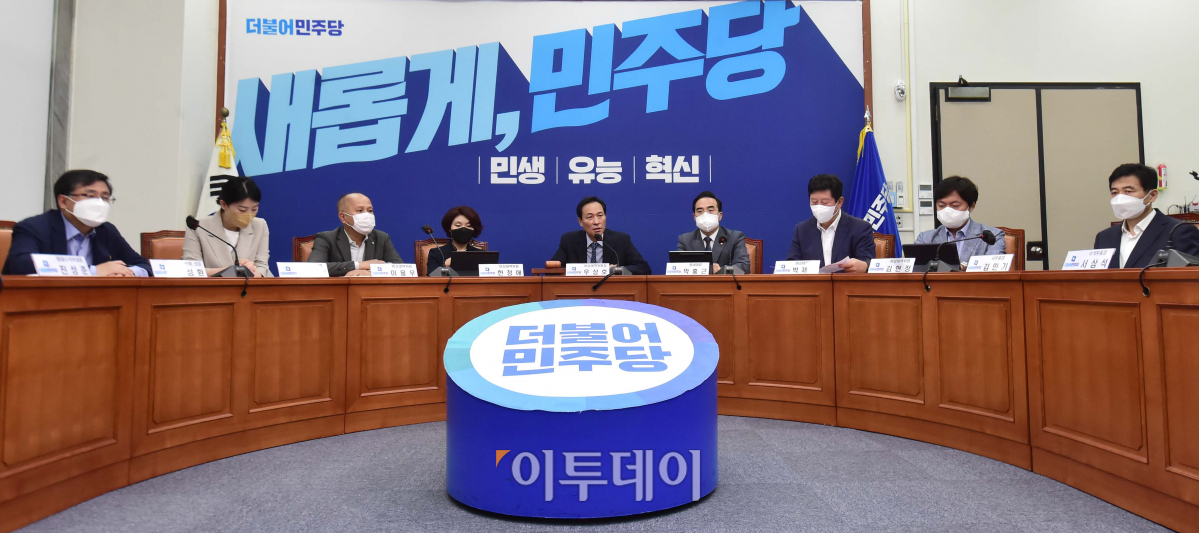 우상호 비대위원장이 27일 서울 여의도 국회 본관 206호에서 열린 더불어민주당 비상대책위원회의에 참석, 회의를 주재하고 있다.