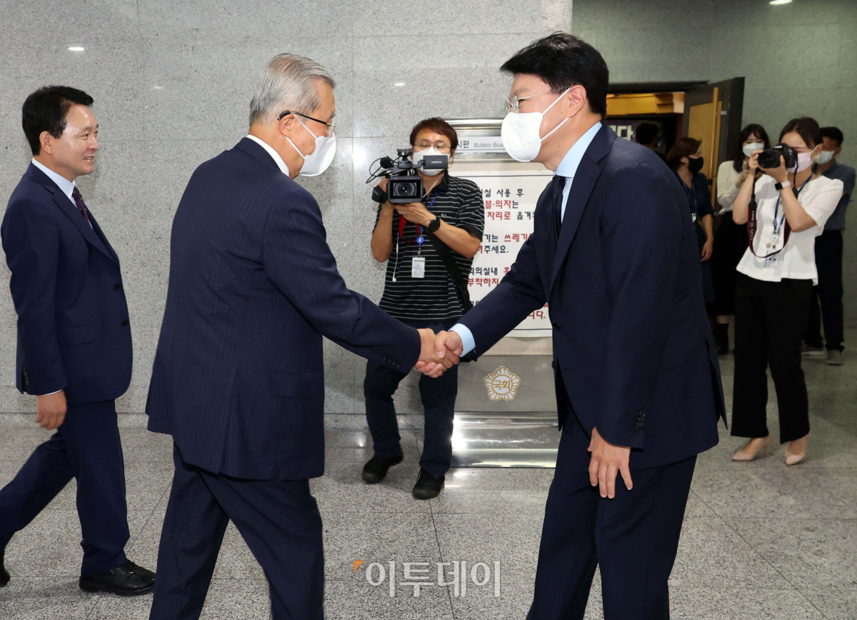 김종인 전 국민의힘 비상대책위원장은 27일 국회 의원회관에서 열린 '대한민국 미래혁신포럼'에서 장제원 의원과 악수를 하고 있다.