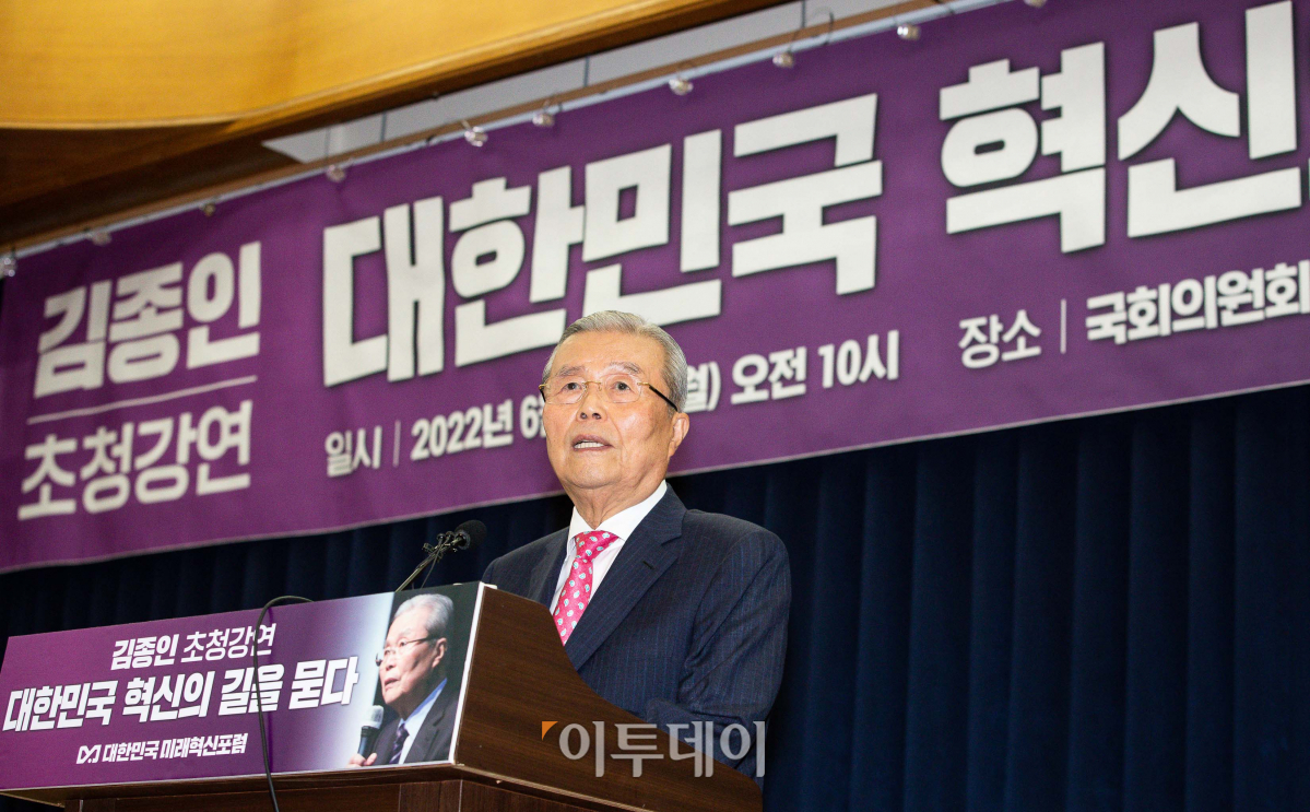 김종인 전 국민의힘 비상대책위원장이 27일 서울 여의도 국회 의원회관에서 열린 '대한민국 미래혁신포럼'에서 '대한민국 혁신의 길을 묻다'를 주제로 강연하고 있다.