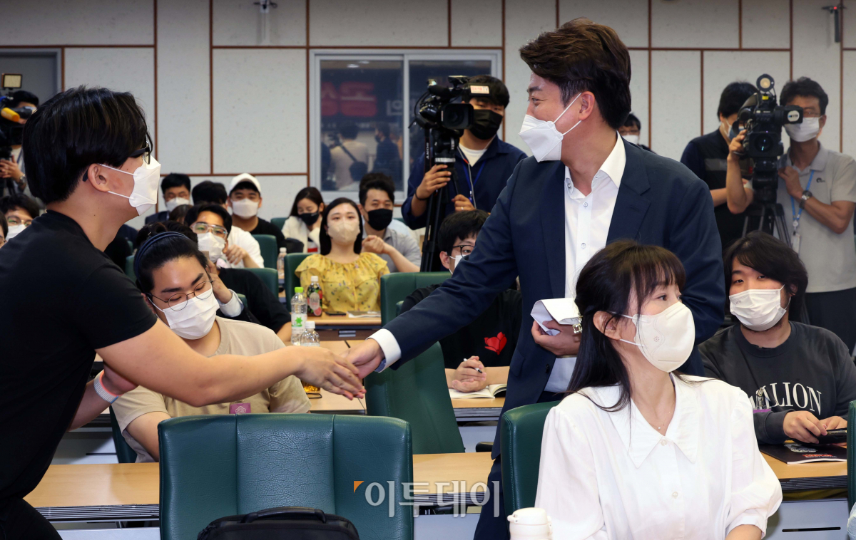 [포토] '반지성 시대의 공성전' 참석자와 인사하는 이준석