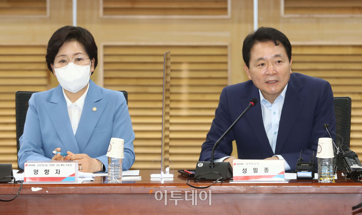 성일종 국민의힘 정책위의장이 28일 오전 서울 여의도 국회 의원회관에서 열린 반도체산업 경쟁력 강화 특별위원회 제1차회의에서 인사말을 하고 있다. 왼쪽은 양향자 위원장.