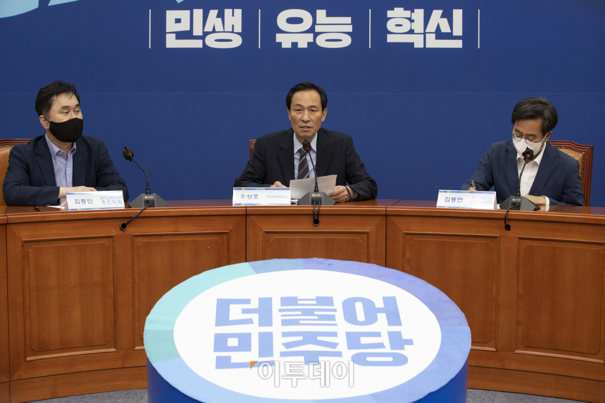 우상호 더불어민주당 비상대책위원장이 28일 오후 서울 여의도 국회에서 열린 더불어민주당 정치교체추진위원회 회의에 참석해 모두 발언을 하고 있다.
