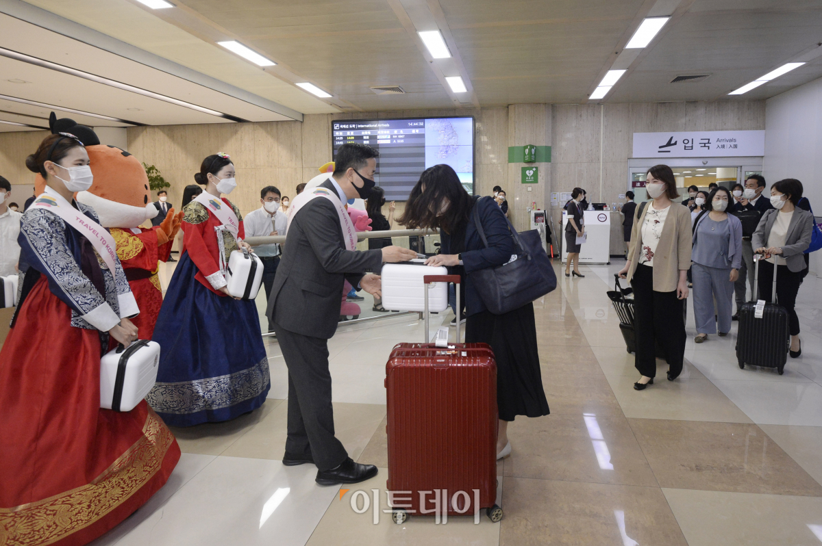 김포공항-하네다 항공노선 운항이 재개된 29일 서울 강서구 김포국제공항 국제선 청사에서 일본인 관광객들이 입국하고 있다. 이날 코로나19 여파로 운항이 중단된 지 2년 3개월만에 아시아나항공과 대한항공이 김포공항-도쿄 하네다공항 운항을 시작했다.