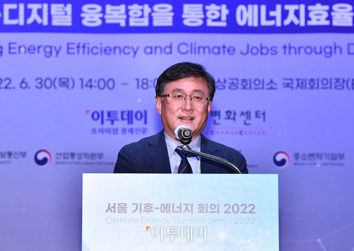 김성환 더불어민주당 의원이 30일 서울 중구 대한상공회의소 국제회의장에서 ‘에너지-디지털 융복합을 통한 에너지효율 대전환’을 주제로 열린 ‘제6회 서울 기후-에너지 회의(CESS) 2022’에서 축사를 하고 있다. 이투데이와 기후변화센터 주최로 열린 이번 행사는 글로벌 에너지효율 기조를 공유하고 대한민국의 나아갈 방향을 모색하기 위해 마련됐다.