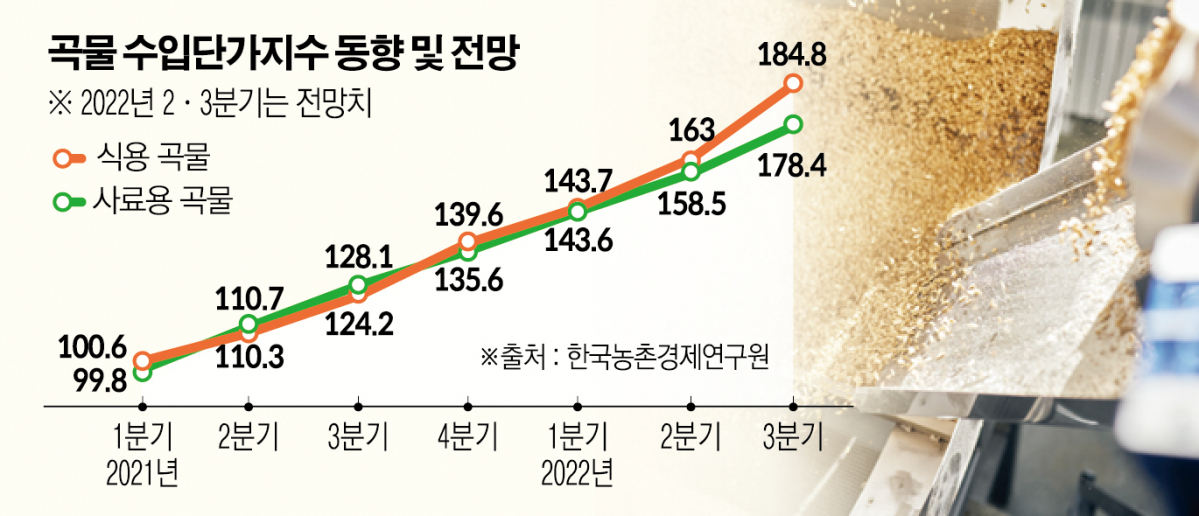 최근 한국농촌경제연구원 농업관측센터가 내놓은 '국제곡물 7월 관측'에 따르면 올해 3분기 곡물 수입단가지수는 식용 184.8, 사료용 178.4로 조사됐다. 수입단가지수는 2015년을 100으로 봤을 때 현재 가격을 나타낸다.