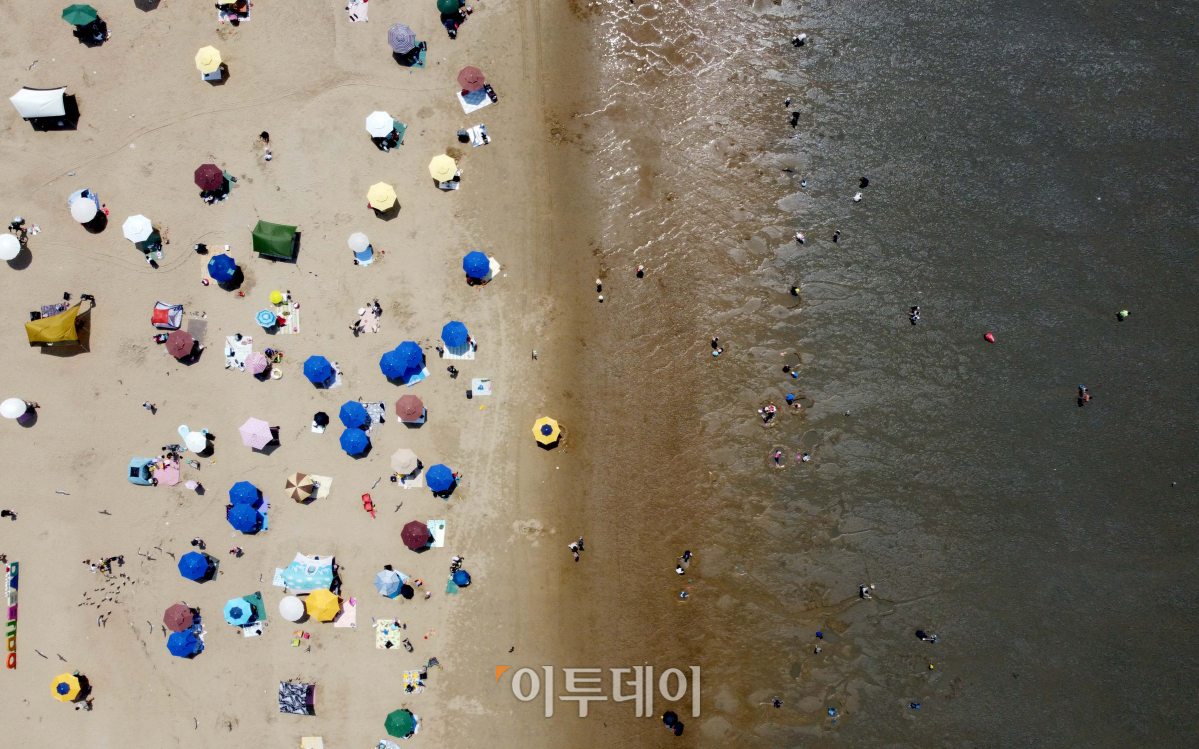 서울 낮 최고기온이 33도를 기록하는 등 전국 대부분 지역에 폭염특보가 발효된 3일 경기 안산시 대부도 방아머리해수욕장이 피서객들로 붐비고 있다. 1일부터 순차적으로 전국 261곳의 해수욕장이 개장했다. 올해는 해수욕장 이용 시 생활 속 방역 수칙이 적용됐으며, 이용객들의 야외 마스크 착용 의무는 해제됐다.