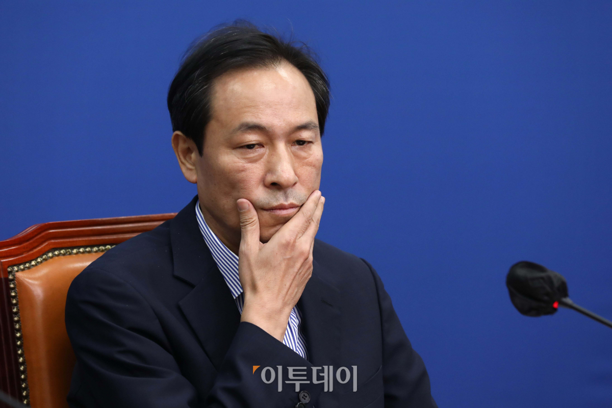 더불어민주당 우상호 비상대책위원장이 4일 오전 국회에서 열린 비상대책위원회의에서 얼굴을 만지고 있다.