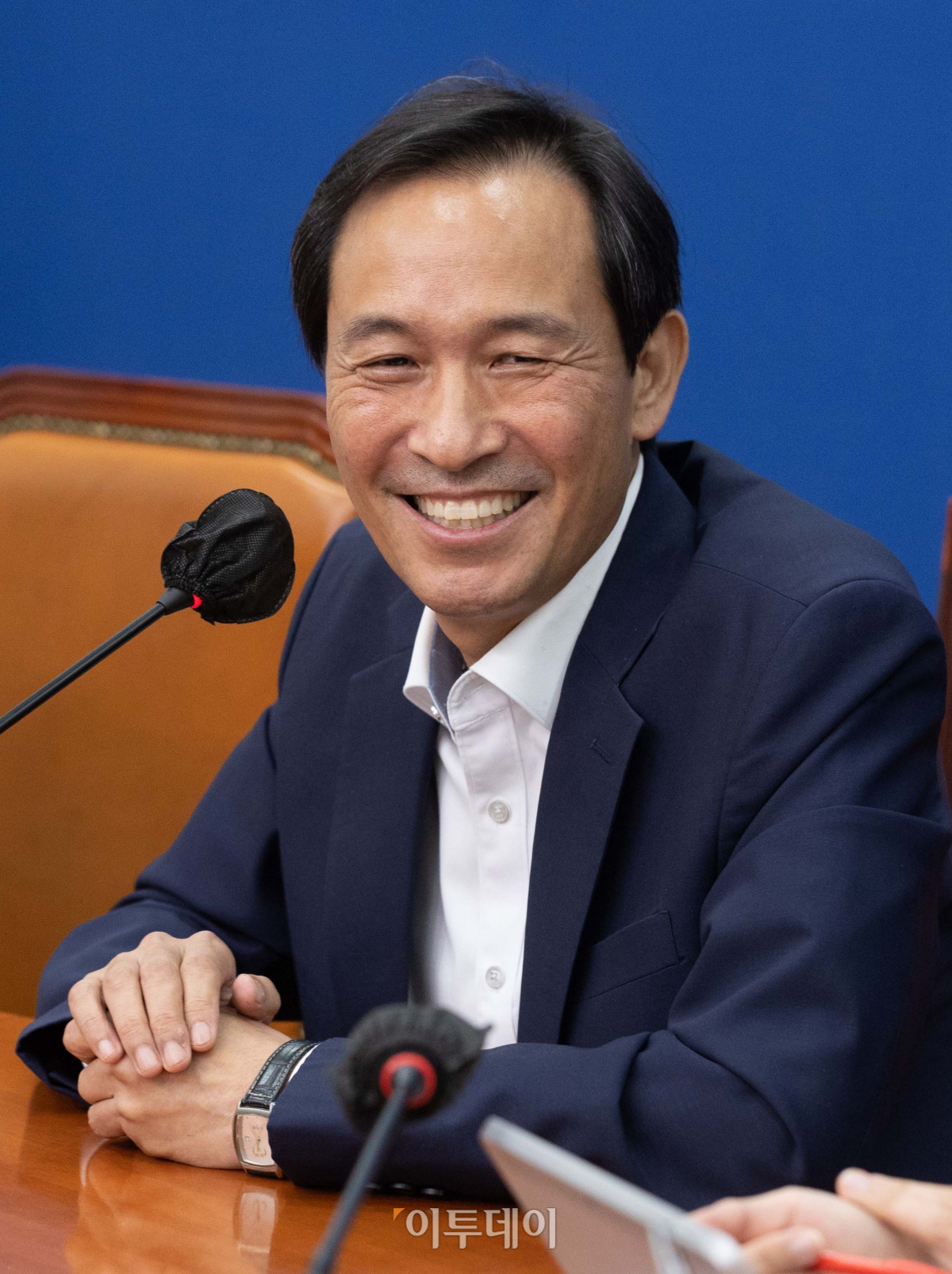 우상호 더불어민주당 비상대책위원장이 6일 서울 여의도 국회에서 비공개 당무위원회를 마친 후 기자간담회를 하고 있다.