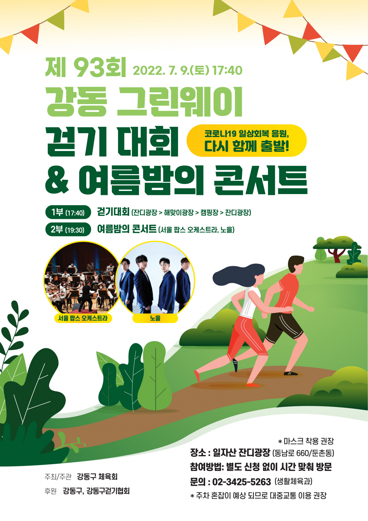 강동구는 토요일인 9일 일자산 잔디공원에서 ‘강동그린웨이 걷기대회 & 여름밤의 콘서트’가 열린다고 7일 밝혔다.