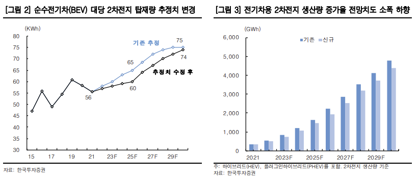 김정환 한국투자증권 연구원은 “인플레이션에 따른 실질 구매력 감소와 이전보다 비싸진 전기차, 2차전지 가격을 반영해 순수전기차(BEV) 1대당 탑재되는 2차전지 용량 가정을 2025년 65kWh(킬로와트시)에서 60kWh로 낮춘다”며 “자동차 업체는 판매량 증가를 위해 전기차 가격을 낮출 것이고 이는 2차전지에 지불할 수 있는 비용 감소로 이어질 것”이라고 분석했다.