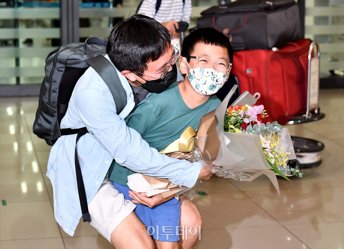 수학계의 노벨상으로 불리는 ‘필즈상’을 수상한 허준이 프린스턴대 교수가 8일 인천 중구 인천국제공항으로 입국해 아들과 포옹하고 있다.