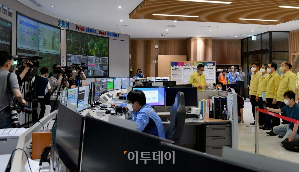 이창양 산업통상자원부 장관이 여름철 전력수급 현장점검을 위해 10일 서울 마포구 한국중부발전 서울발전본부를 찾아 중앙제어실에서 관계자의 설명을 듣고 있다.
