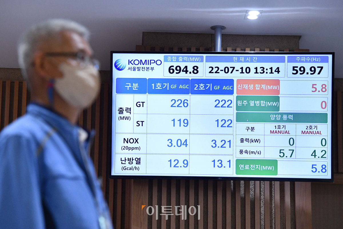 무더위로 전력수요가 폭증하는 가운데 10일 서울 마포구 한국중부발전 서울발전본부 중앙제어실에 발전출력현황이 표시되고 있다.