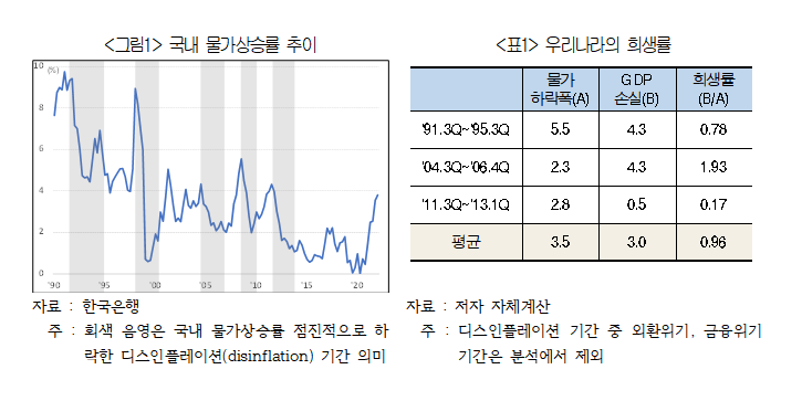 SGI가 과거 물가상승률 둔화기 바탕으로 연구해본 결과 물가상승률 1%포인트(p) 하락시키려면 경제성장률을 0.96%까지 희생해야 하는 것으로 나타났다. 주요 선진국들의 평균 희생률(0.6~0.8)에 비해 다소 높아 국내 경제가 금리인상에 더 민감하게 반응하는 것으로 조사됐다.