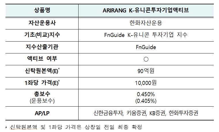 한화자산운용이 내놓은 'ARIRANG K-유니콘투자기업액티브'는 'FnGuide K-유니콘 투자기업 지수'를 추종한다.