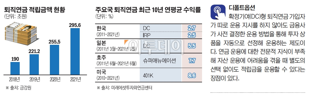 금융당국은 퇴직연금이 장기 수익률을 높이며 향후 노후자산 형성에 중요한 역할을 할 것으로 기대하고 있다. 다만, 투자 무관심층이 여러 선택지를 놓고 혼란스러워하다가 결국 현금성 자산에 머무를 수 있다는 우려도 나온다. 연금 선진국들은 퇴직연금사업자가 디폴트옵션 상품 여러 개를 기업에 제시하면, 해당 기업은 그중 하나를 골라 근로자 대표의 동의를 얻어 디폴트옵션 상품으로 지정하게 했다.