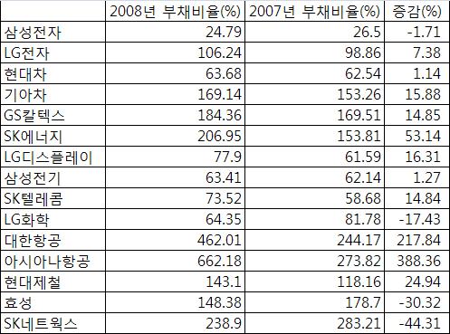 특히 기업 경영환경이 악화되면서 주요 대기업의 부채비율이 대부분 두자릿 수의 증가세를 보였다.