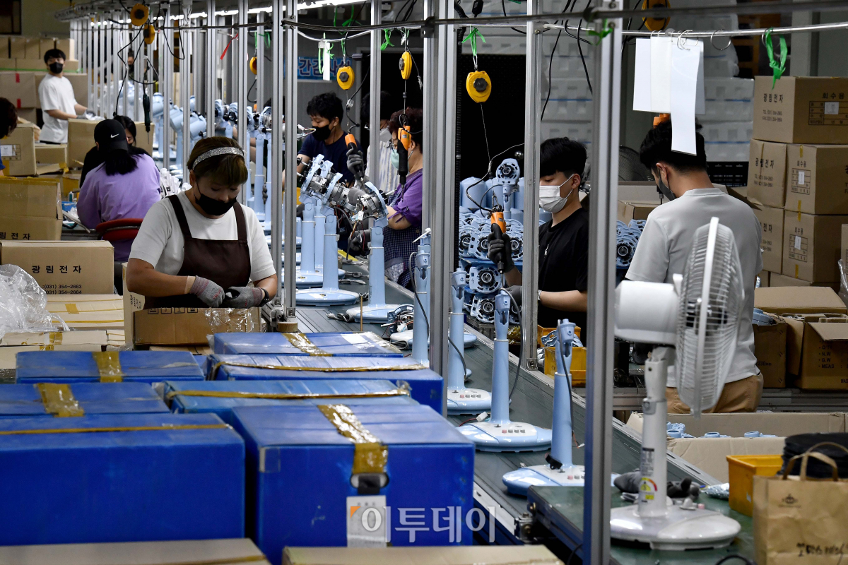 무더위가 계속되는 가운데 11일 충남 천안시 신일전자 천안공장에서 여름 성수기를 맞아 직원들이 선풍기 생산에 바쁜 일손을 놀리고 있다. 최근 한 달 신일 천안공장의 일평균 선풍기 생산량은 4500대로 19초에 1대를 생산하고 있다.