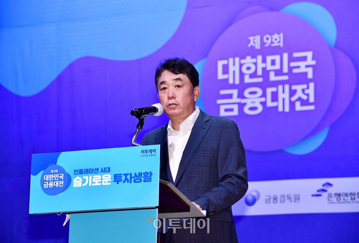 김상철 이투데이 대표이사가 12일 서울 중구 대한상공회의소 국제회의장에서 열린 ‘제9회 대한민국 금융대전’에서 환영사를 하고 있다. 이투데이가 ‘인플레이션 시대 슬기로운 투자생활’을 주제로 개최한 이날 재테크 세미나에선 빚투, 영끌로 시작해 ‘코인존버’, ‘하우스푸어’로 이어지는 MZ세대 투자자뿐 아니라 자신만의 투자 철학을 세우려는 이들을 위한 전문가의 강연이 이어졌다.