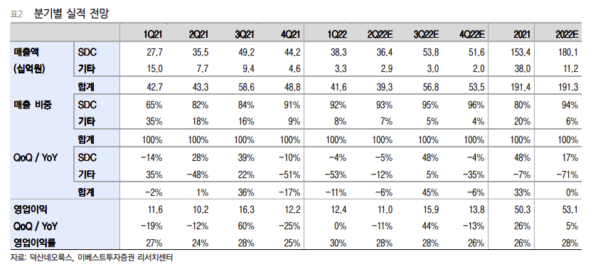 남대종 이베스트투자증권 연구원은 “올해 2분기 실적은 매출액 393억 원, 영업이익 110억 원으로 시장 전망치인 영업이익 117억 원을 밑돌 것으로 예상한다”며 “중국 스마트폰 업체들의 수요 둔화, 상하이 봉쇄 영향이 주요 원인”이라고 분석했다.