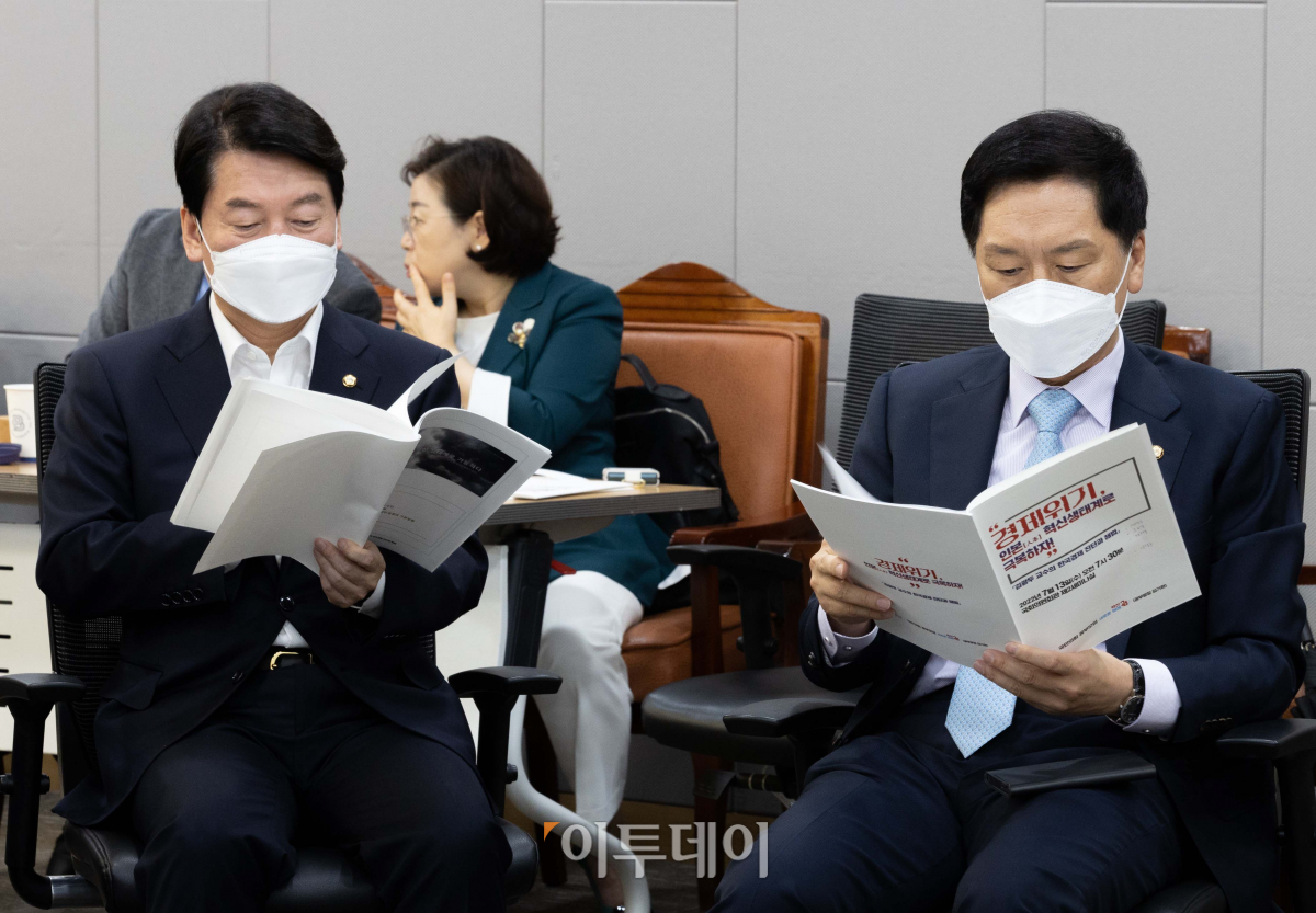안철수(왼쪽), 김기현 국민의힘 의원이 13일 오전 서울 여의도 국회 의원회관에서 열린 혁신 24 새로운 미래 두번째 모임인 ‘경제위기 인본 혁신생태계로 극복하자!’에서 책자를 살펴보고 있다.