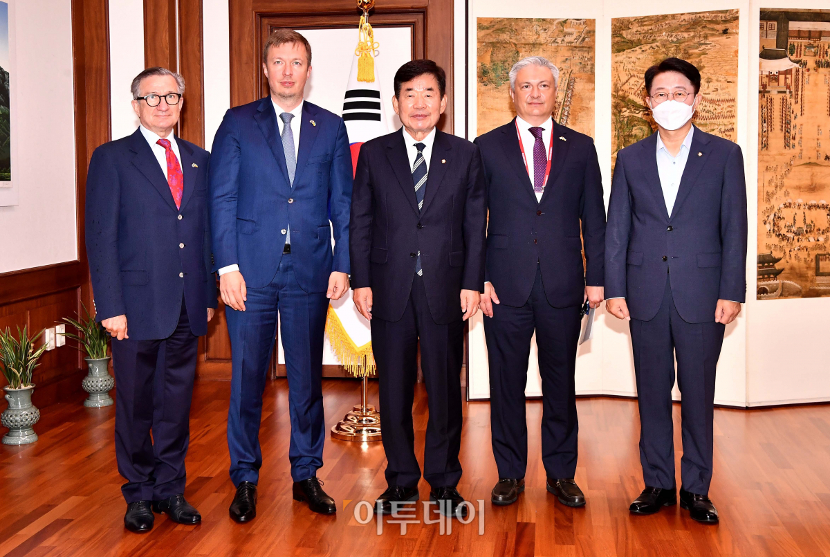 김진표 국회의장이 13일 서울 여의도 국회에서 우크라이나-한 의원친선협회의 접견을 받고 기념촬영을 하고있다. 사진 왼쪽부터 세르히 타루타 우크라이나-한 의원친선협회 회원, 안드리 니콜라엔코 우크라이나-한 의원친선협회 부회장, 김 의장, 드미트로 포노마렌코 주한우크라이나대사, 한-우크라이나 의원친선협회장인 조정식 더불어민주당 의원.