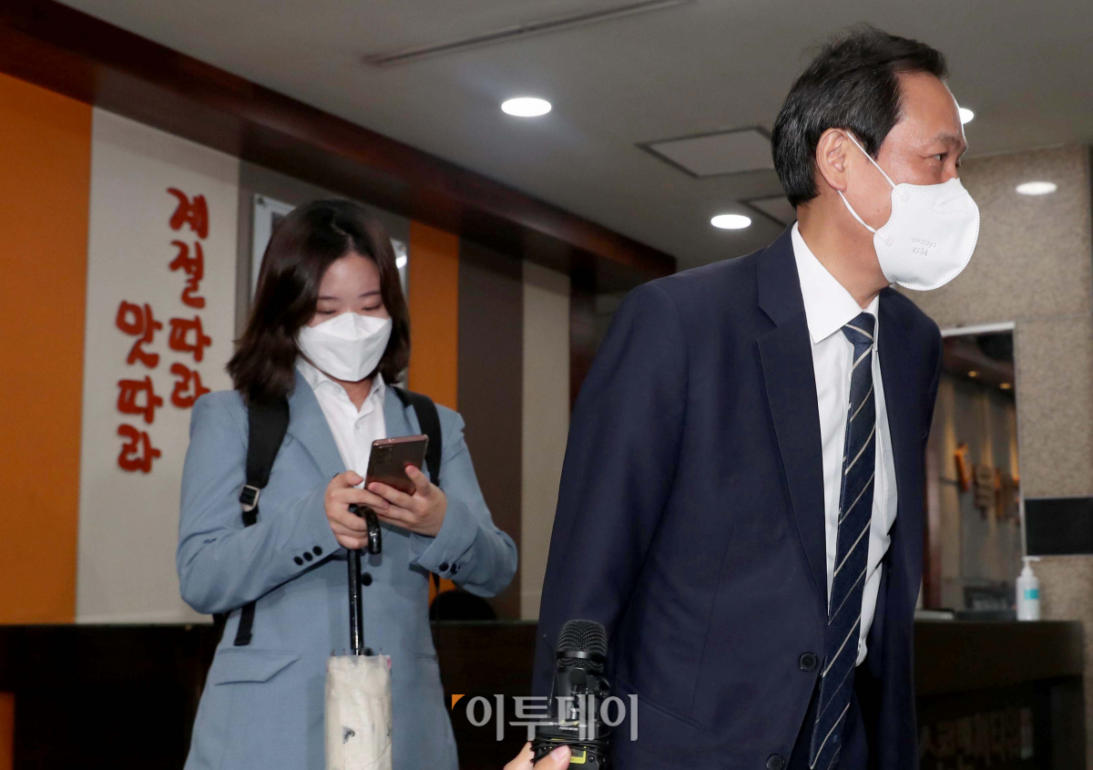 우상호(오른쪽) 더불어민주당 비상대책위원장과 박지현 전 공동비상대책위원장이 13일 오후 서울 영등포구 여의도의 한 식당에서 오찬 회동을 마친 후 자리를 나서고 있다.