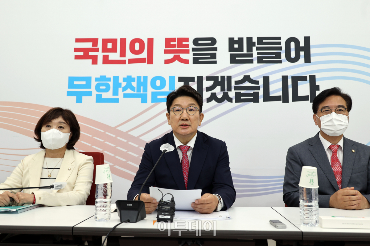 국민의힘 권성동 원내대표가 17일 서울 여의도 국회 원내대표실에서 취임 100일 기자간담회를 갖고 있다.