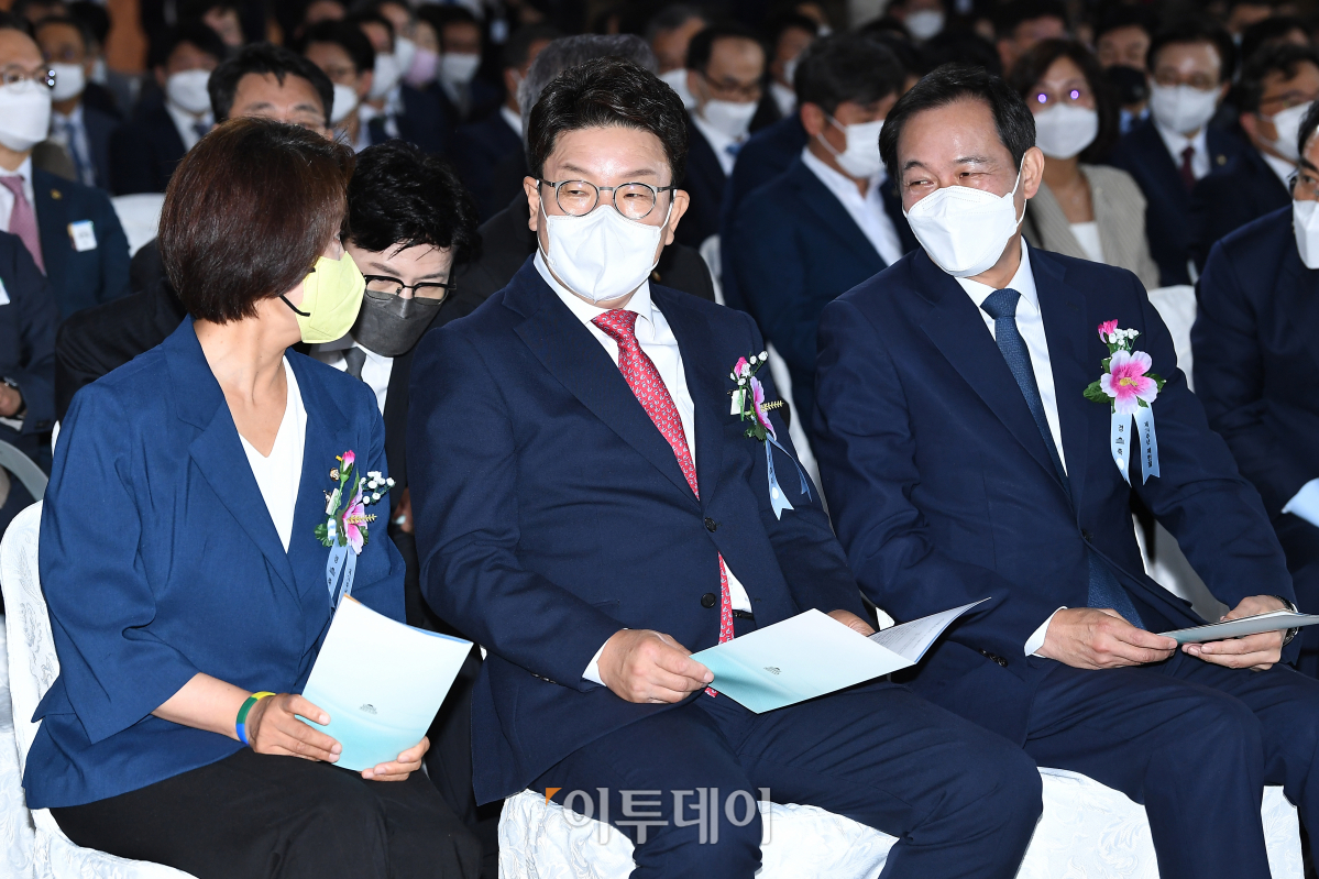 이은주 정의당 비상대책위원장(왼쪽부터), 권성동 국민의힘 대표 직무대행 겸 원내대표, 우상호 더불어민주당 비상대책위원장이 17일 서울 여의도 국회 로텐더홀에서 열린 제74주년 제헌절 경축식에서 대화를 나누고 있다.