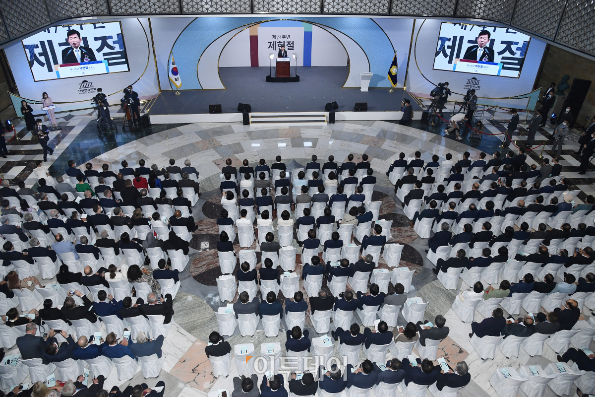 김진표 국회의장이 17일 서울 여의도 국회 로텐더홀에서 열린 제74주년 제헌절 경축식에서 경축사를 하고 있다.