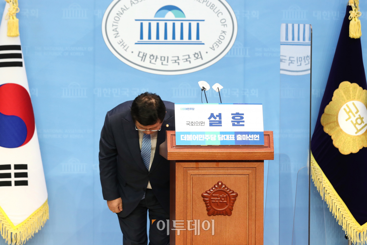 더불어민주당 설훈 의원이 17일 서울 여의도 국회 소통관에서 당대표 출마 선언 기자회견에 앞서 인사하고 있다.