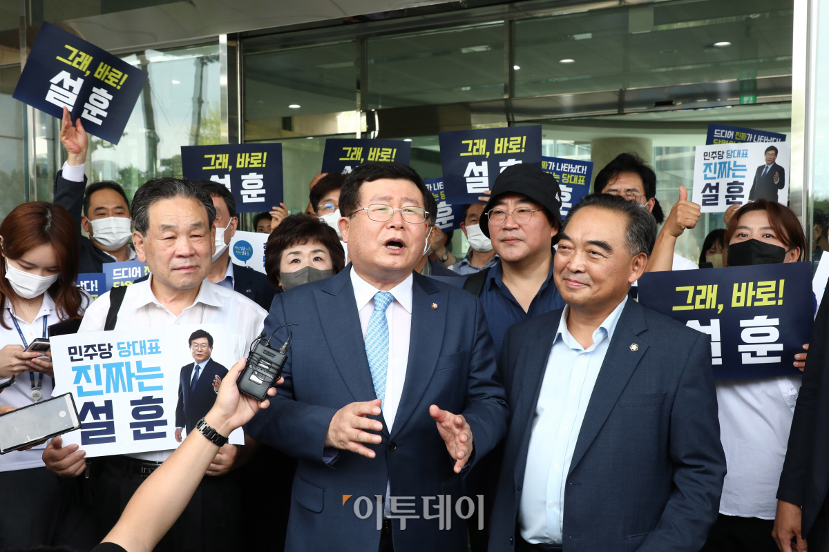 더불어민주당 설훈 의원이 17일 서울 여의도 국회 소통관에서 당대표 출마 선언 기자회견을 마친 후 회견장을 찾아 온 지지자들에게 인사하고 있다.