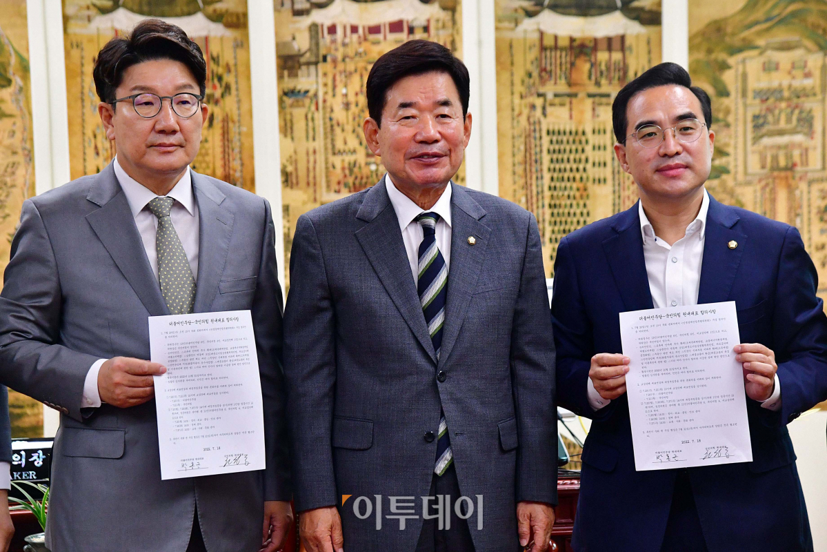 권성동 국민의힘 원내대표와 박홍근 더불어민주당 원내대표가 18일 서울 여의도 국회 의장실에서 김진표 국회의장 주재로 열린 여야 원내대표 회동에서 민생경제안정특별위원회 구성과 교섭단체 대표연설과 대정부질문을 위한 본회의 일정에 합의하고 합의문을 들어보이고 있다.