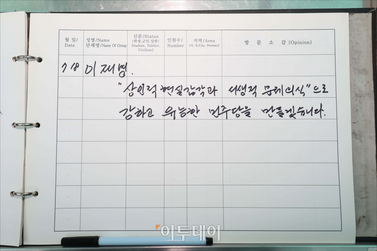 당대표 출마를 선언한 이재명 더불어민주당 의원이 18일 오전 서울 동작구 국립서울현충원 김대중 대통령 묘소에서 참배를 마친 뒤 방명록을 적고 있다. 사진은 이 의원이 남긴 방명록. 국회사진취재단