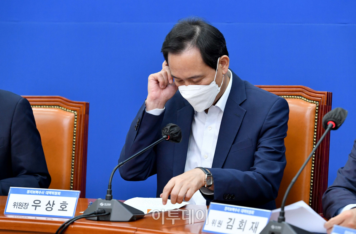 우상호 더불어민주당 비상대책위원장이 18일 서울 여의도 국회에서 열린 민주당 정치보복수사대책위원회 공개회의에서 자료를 살펴보고 있다.