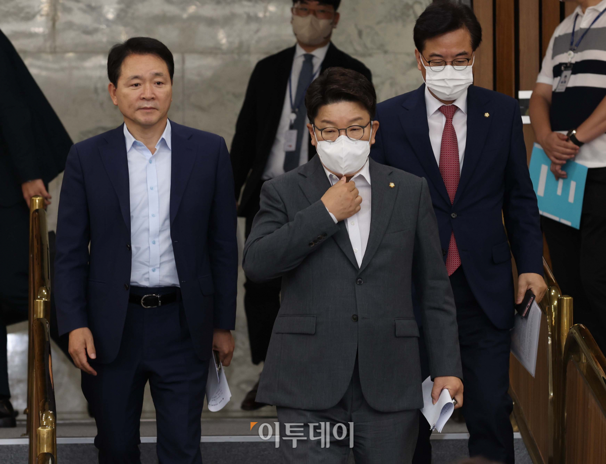 권성동 국민의힘 대표 직무대행 겸 원내대표와 성일종 정책위의장이 19일 오전 서울 여의도 국회에서 열린 원내대책회의에 참석하고 있다.