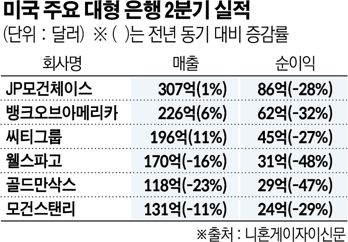 골드만삭스뿐만 아니다. 이제까지 실적을 발표한 JP모건체이스, 뱅크오브아메리카(BOA), 씨티그룹, 웰스파고 등도 1분기에 이어 2개 분기 연속 두 자릿수 순익 감소세를 기록했다. 지난해 4분기까지만 해도 JP모건, BOA, 골드만삭스, 모건스탠리 등 4개 은행이 사상 최고 실적을 달성했으나 올해 들어서는 부진을 면치 못하고 있다.