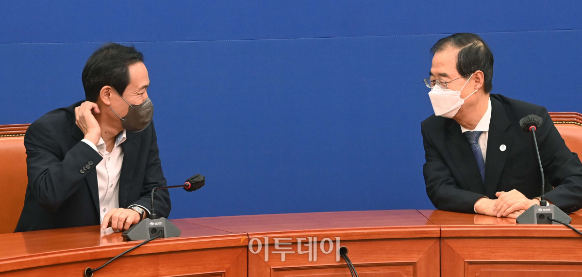 더불어민주당 우상호 비상대책위원장과 한덕수 국무총리가 20일 서울 여의도 국회 더불어민주당 당대표실에서 대화하고 있다.