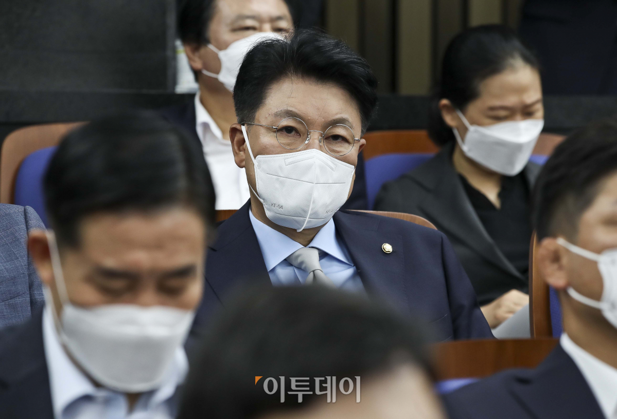 국민의힘 장제원 의원이 20일 서울 여의도 국회에서 열린 의원총회에 참석하고 있다.