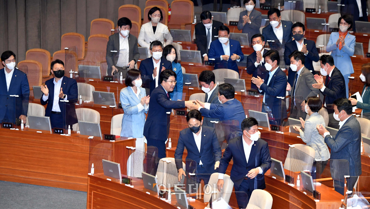 권성동 국민의힘 당 대표 직무대행 겸 원내대표가 21일 서울 여의도 국회에서 열린 본회의에서 교섭단체 대표연설을 마친 뒤 동료 의원들과 인사하고 있다.