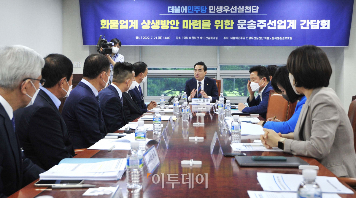 박홍근 더불어민주당 원내대표가 21일 오후 서울 여의도 국회 의원회관에서 열린 '화물업계 상생방안 마련을 위한 운송주선사업자 간담회'에서 모두발언을 하고 있다.