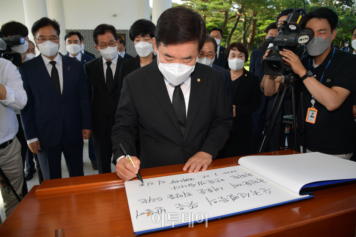 김진표 국회의장이 25일 오전 서울 동작구 국립서울현충원을 찾아 현충탑을 참배를 마친 후 방명록을 작성하고 있다. 국회사진취재단
