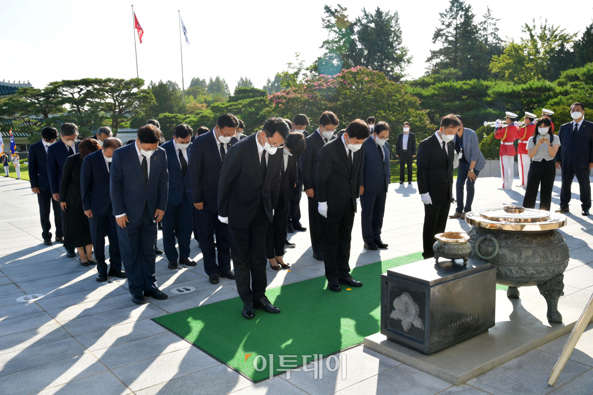 김진표 국회의장을 비롯한 제21대 국회 후반기 국회의장단과 상임위원장들이 25일 오전 서울 동작구 국립서울현충원을 찾아 현충탑을 참배하고 있다. 국회사진취재단